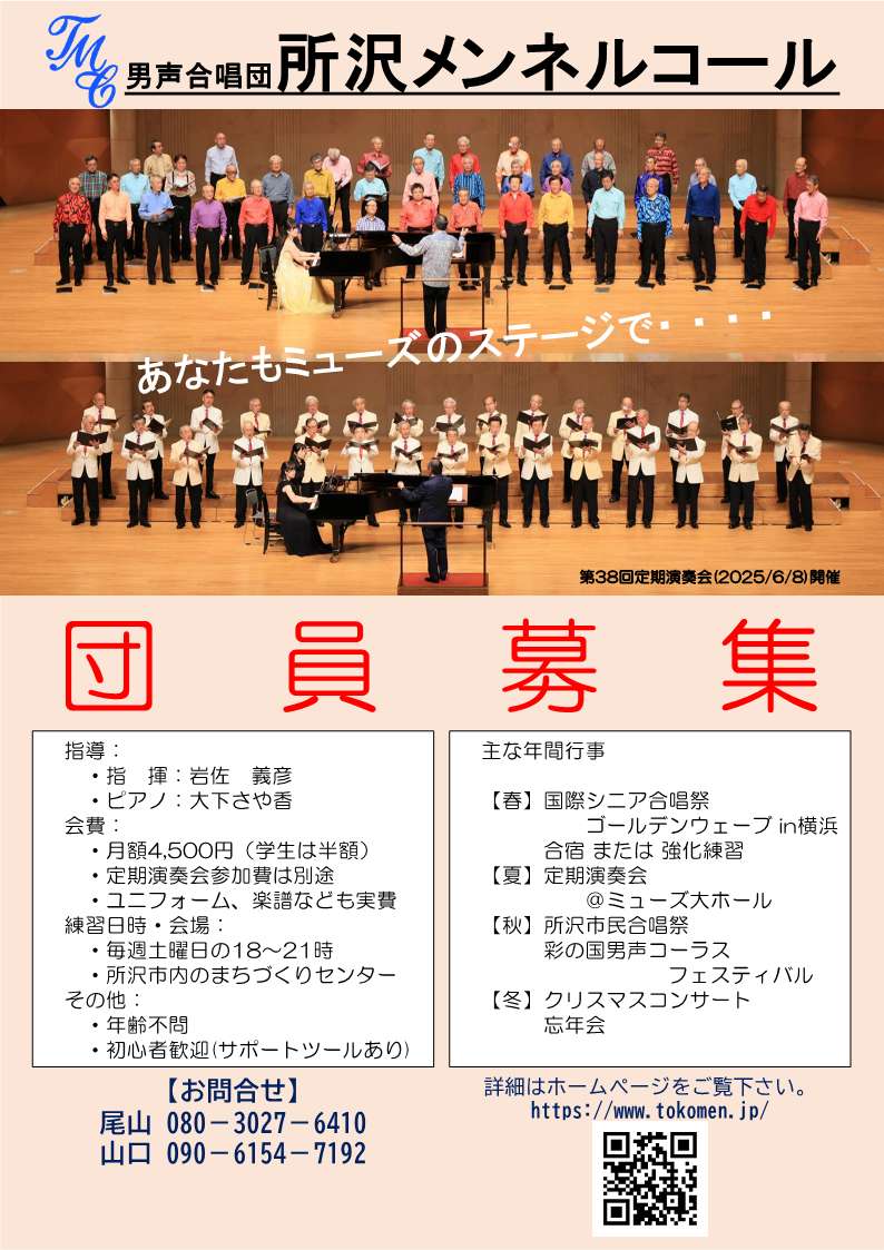 所沢メンネルコールは1987年1月に、『所沢で第九を』で歌っていた男たちが、半年間も『歌なしではつまらない』として結成した男声合唱団であり、今年で38年目を迎えています。現在では約30名の団員を擁する埼玉県では代表的な男声合唱団になりました。団員は所沢あるいは近郊に住む幅広い年齢層で構成されています。
